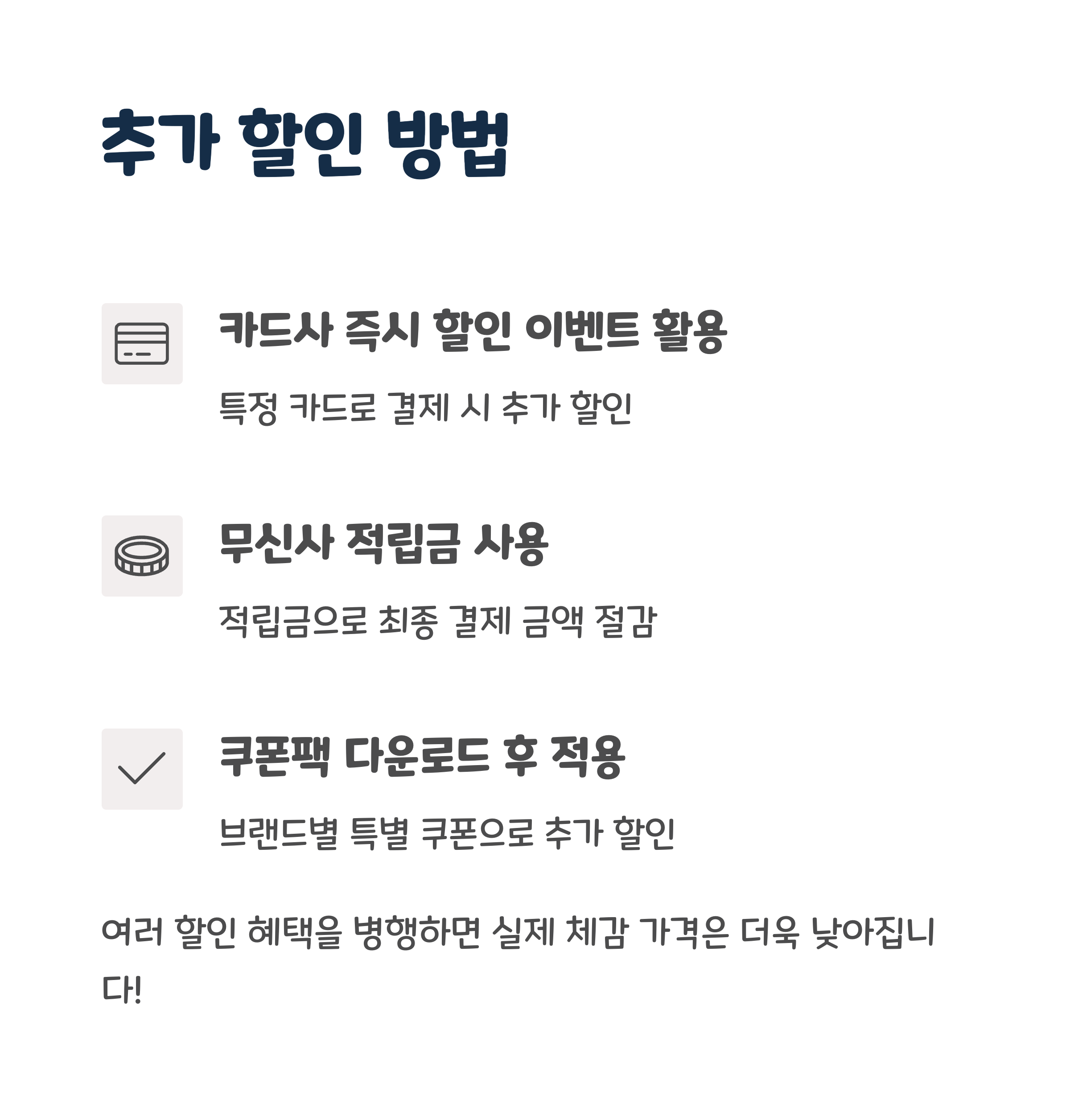"여러 할인 혜택을 병행하면 실제 체감 가격은 더욱 낮아집니다!"