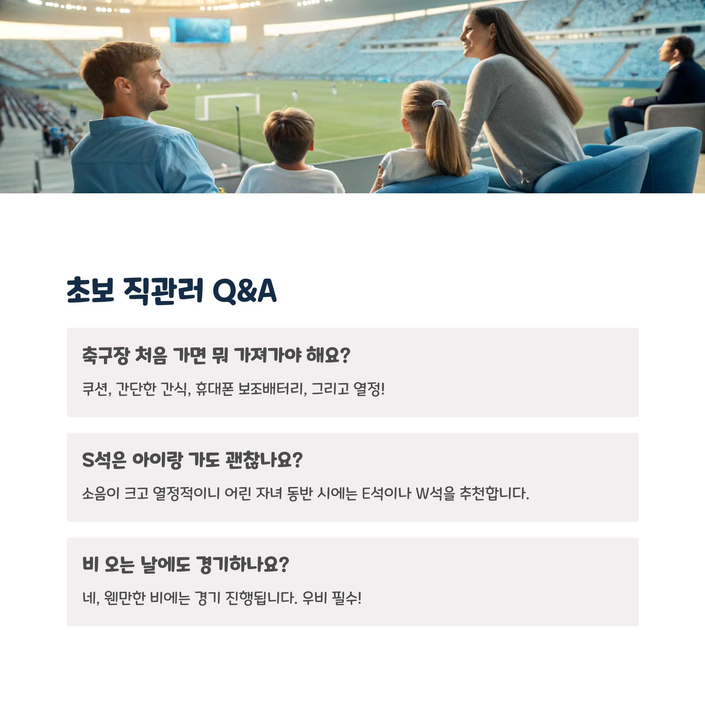 A: 소음이 크고 열정적이니 어린 자녀 동반 시에는 E석이나 W석을 추천합니다. - Q: "비 오는 날에도 경기하나요?"