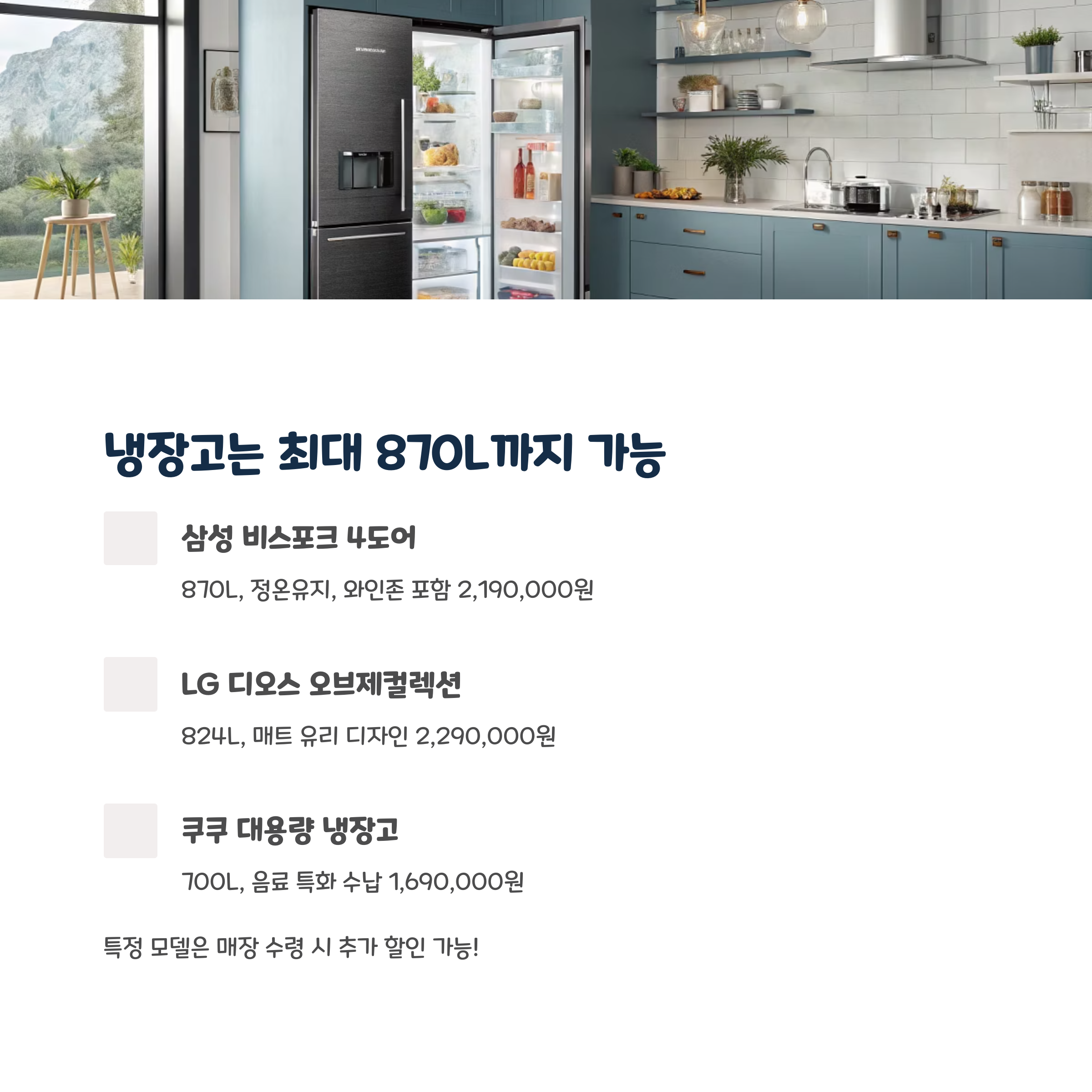 | 삼성 비스포크 4도어 | 870L | 정온유지, 와인존 포함 | 2,190,000원 |