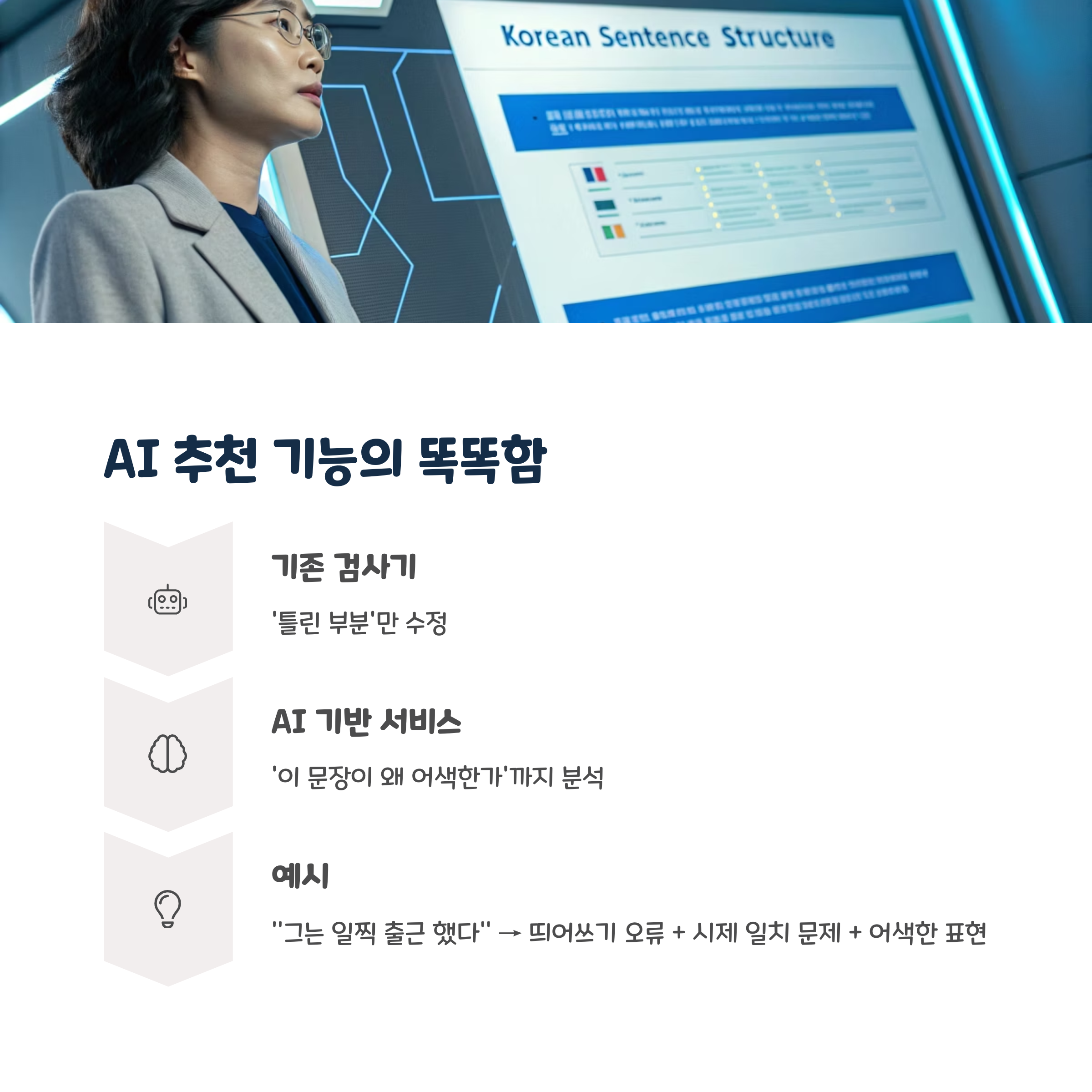 띄어쓰기, 문장 부호, 어색한 표현, 문맥 오류까지 잡아주는 AI 기능이 핵심입니다.