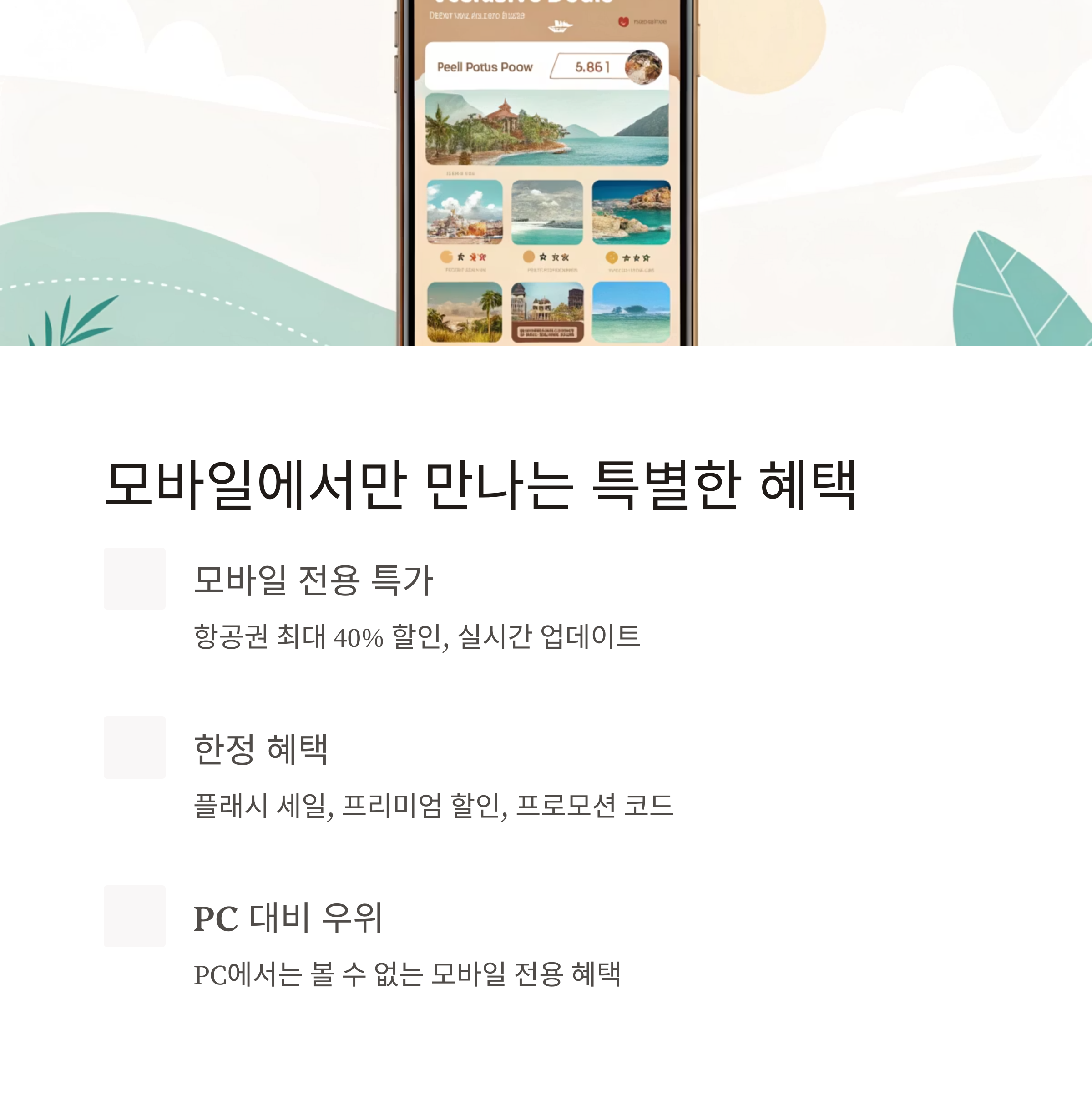 모바일에서만 노출되는 특가 항공권, 호텔, 렌터카가 실시간으로 업데이트됩니다.