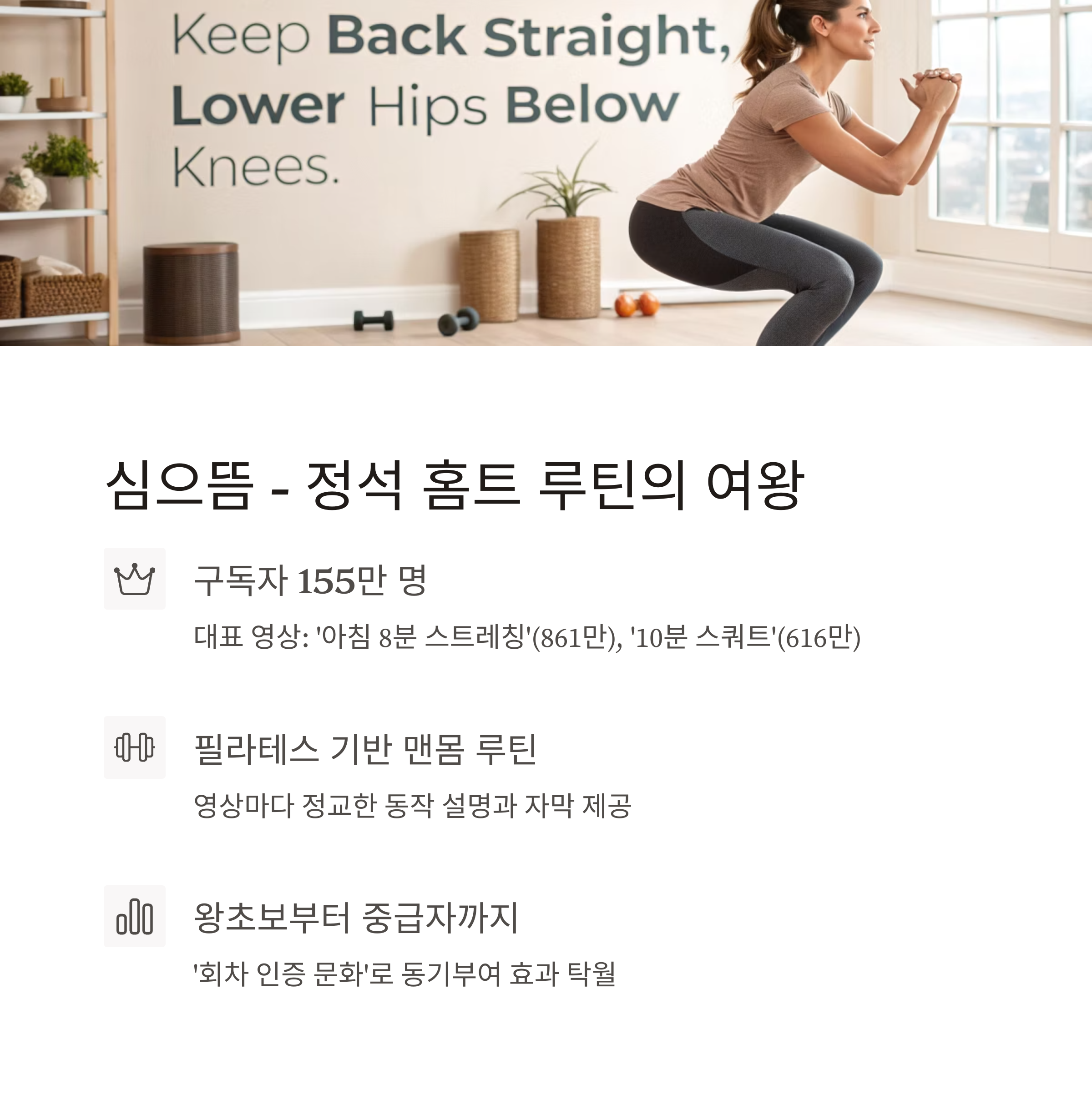 대표 영상: ‘아침 8분 스트레칭’(861만), ‘10분 스쿼트’(616만)