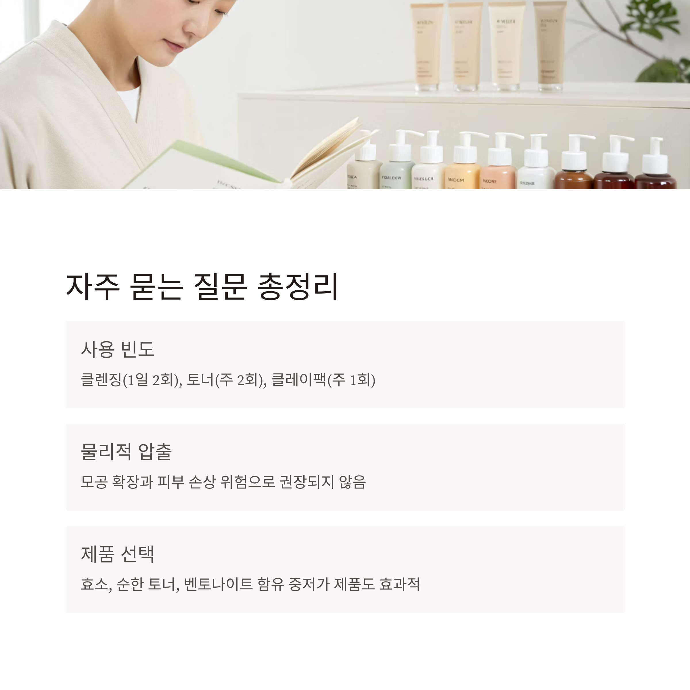 A: 아니요. 효소 성분, 순한 토너, 벤토나이트 클레이 함유 여부만 체크하면 중저가 제품도 효과적입니다.