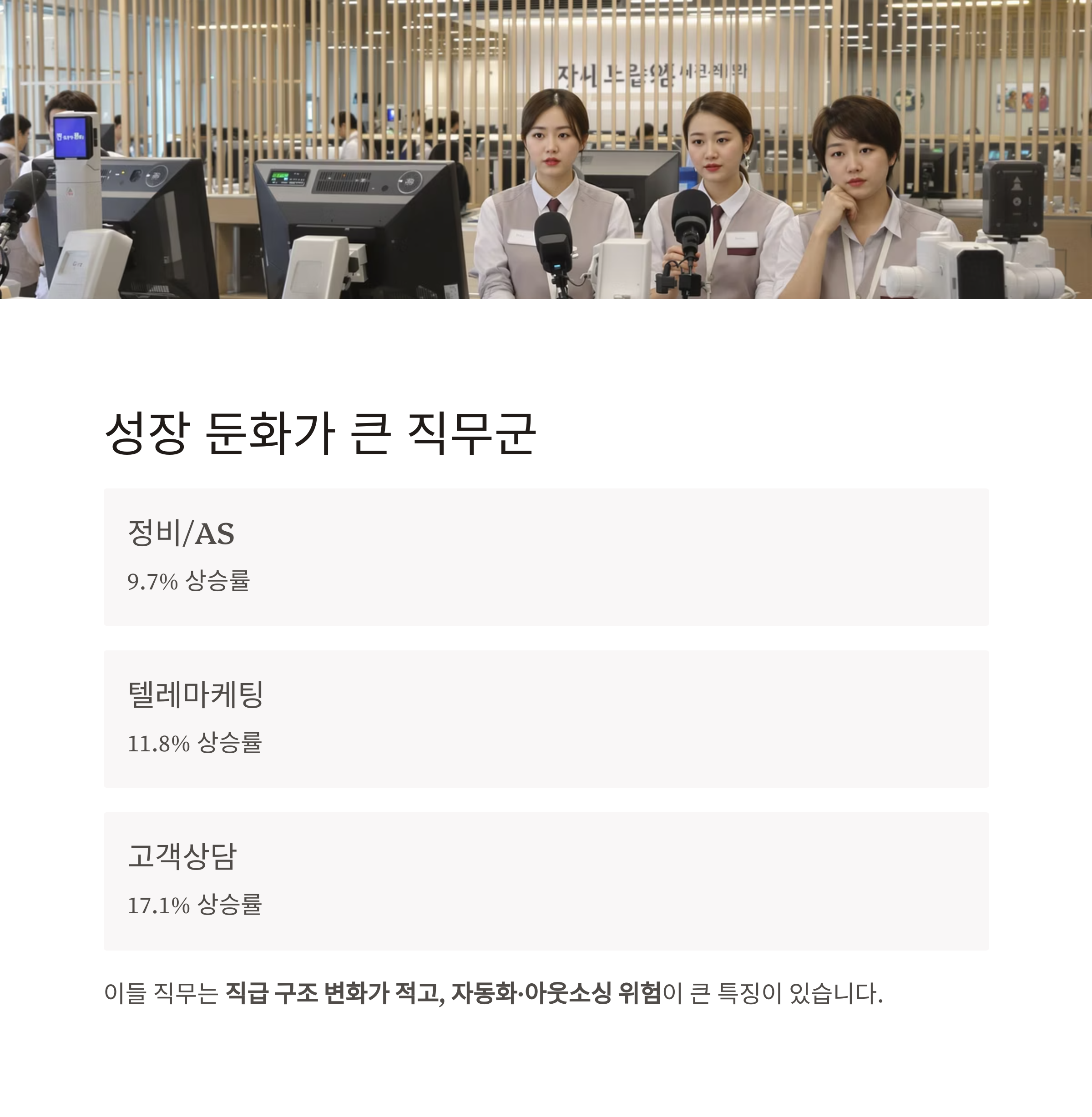 이들 직무는 기업 내 직급 구조의 변화가 적고, 자동화·아웃소싱 위험이 큰 것이 특징입니다.