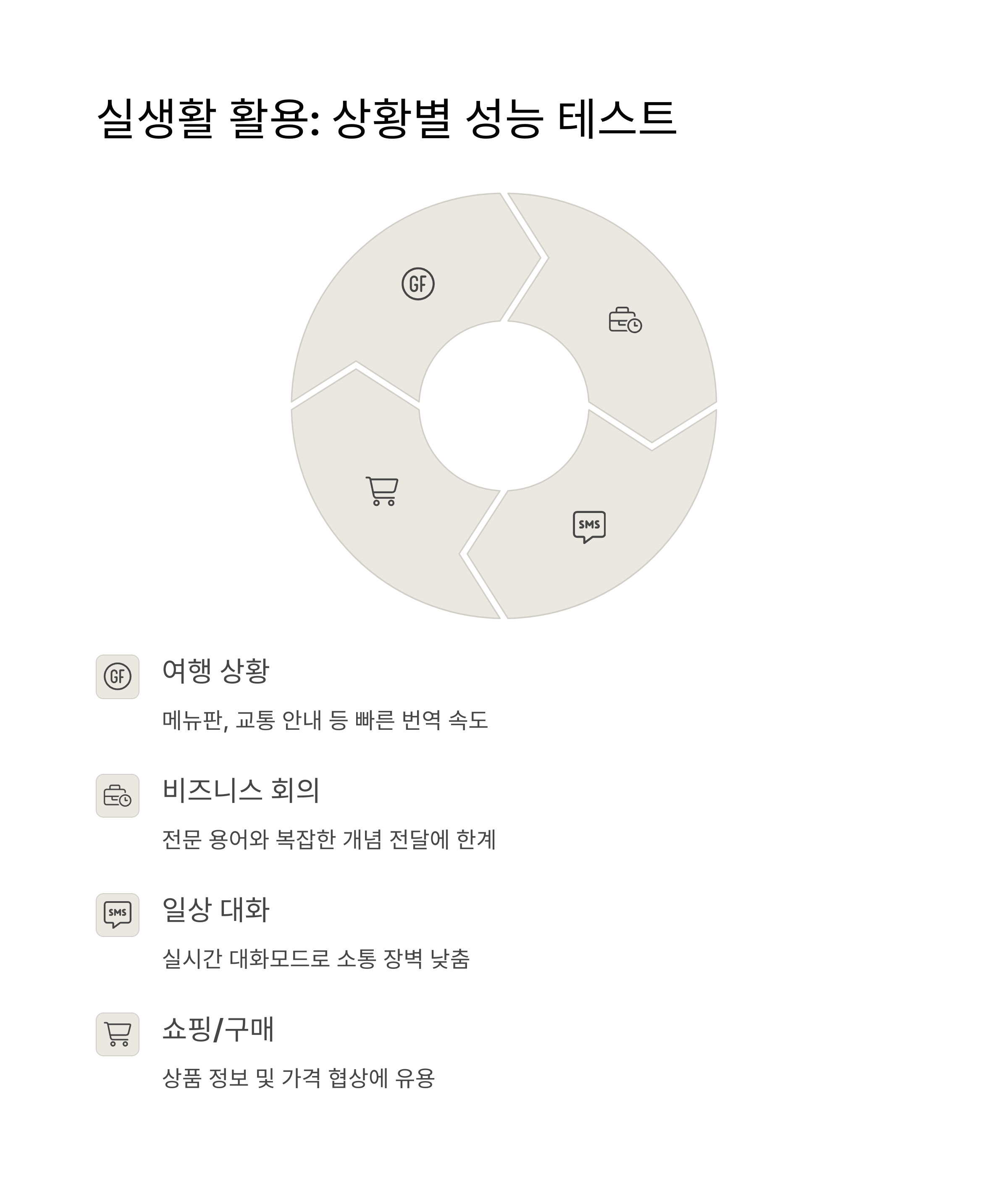 상황별 통역 성능 - 여행, 회의, 일상 대화