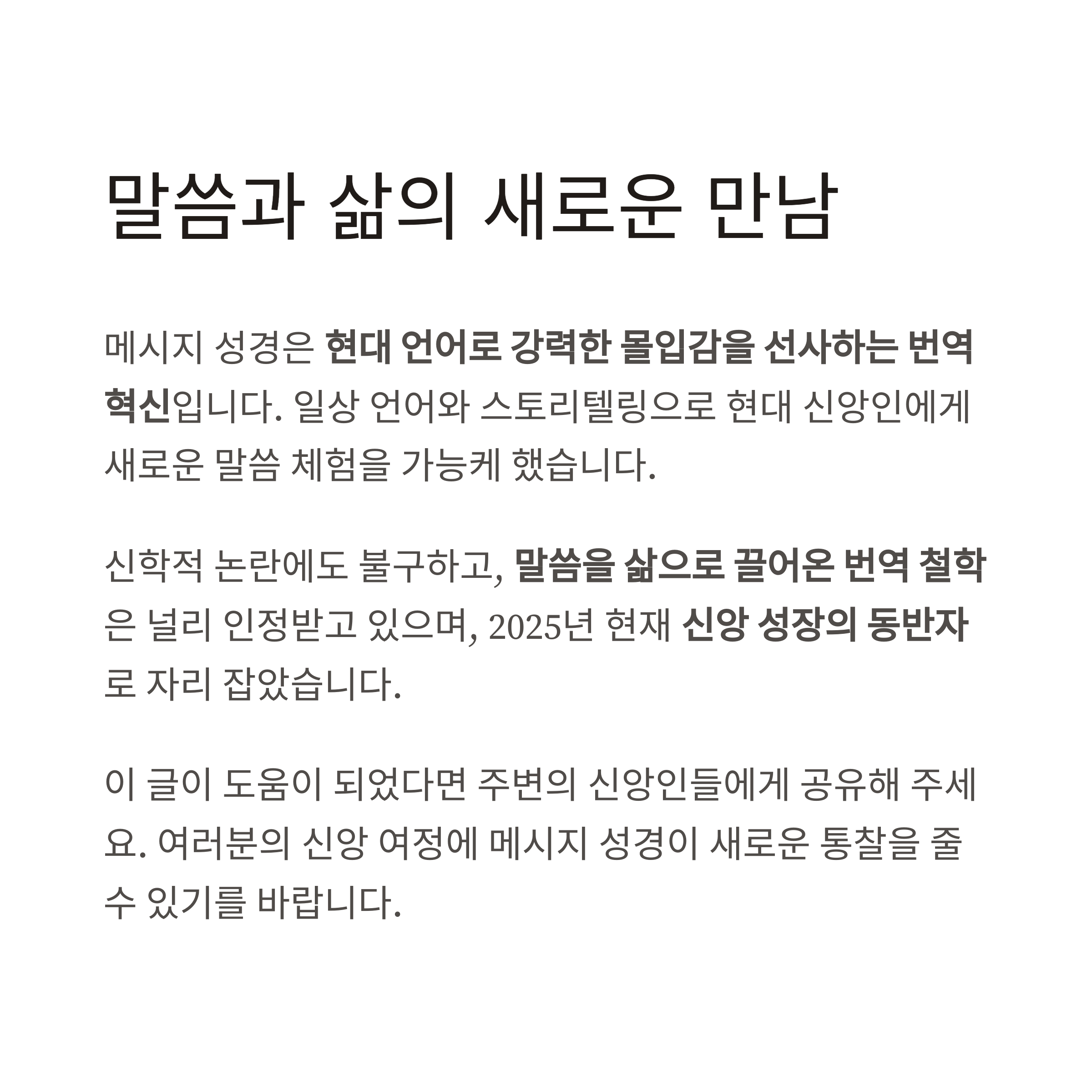 - 2025년 현재, 메시지 성경은 교회 안팎에서 신앙 성장의 동반자로 자리 잡고 있다.