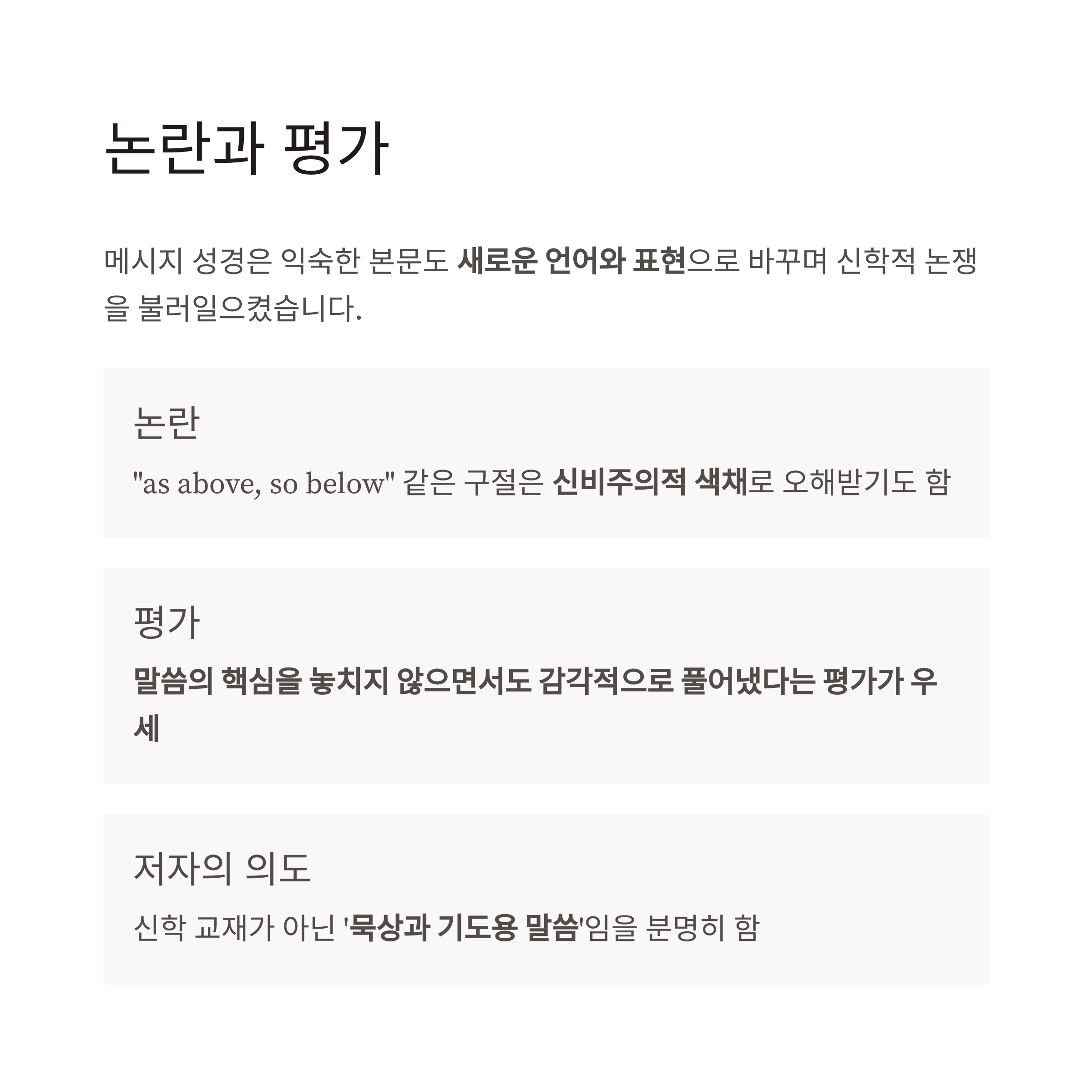 - 신학적 논란에도 불구하고, 말씀을 삶으로 끌어온 번역 철학은 널리 인정받고 있다.