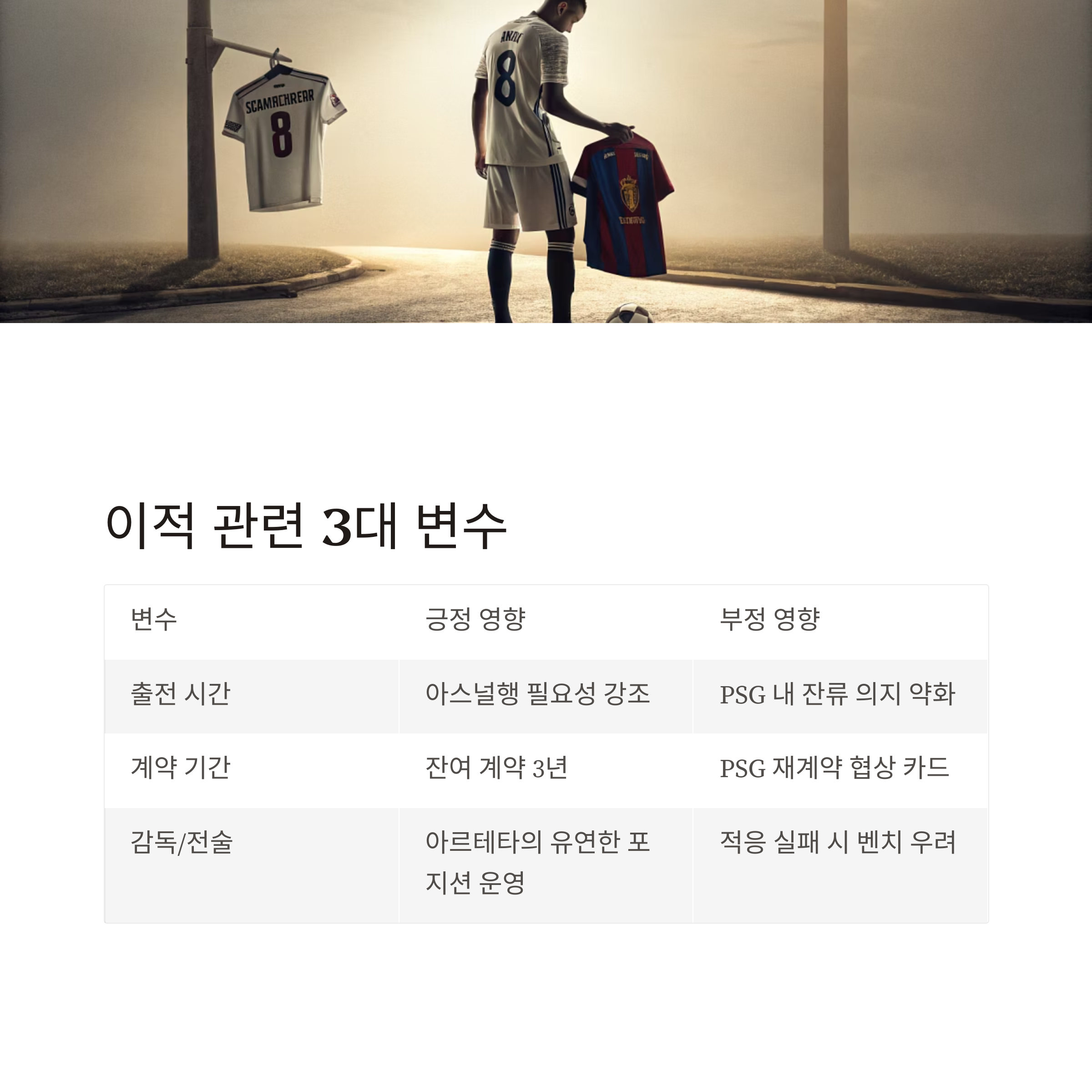 | 출전 시간 | 아스널행 필요성 강조 | PSG 내 잔류 의지 약화 |