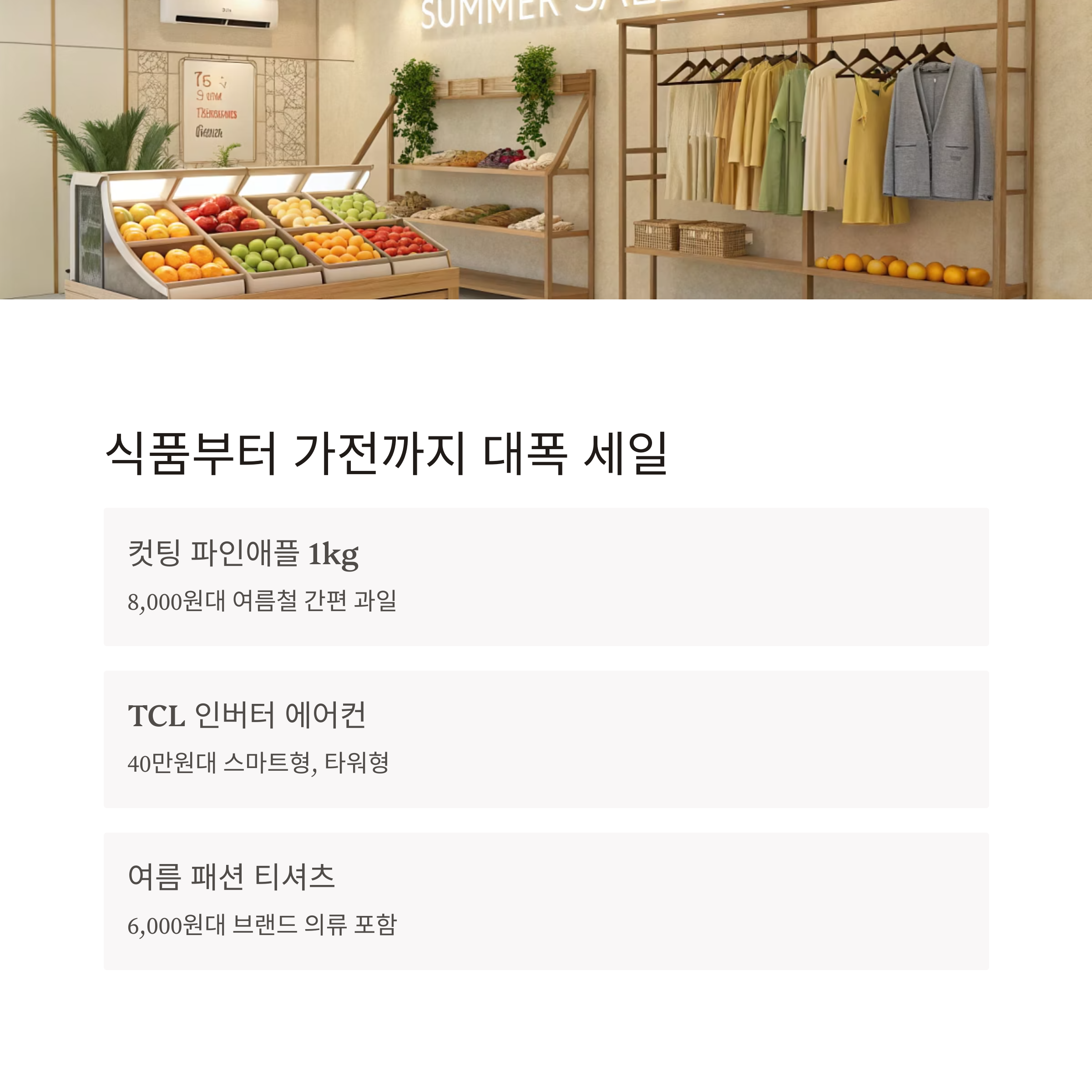 | 여름 패션 티셔츠 | 6,000원대 | 브랜드 의류 포함, 최대 80% 할인 |