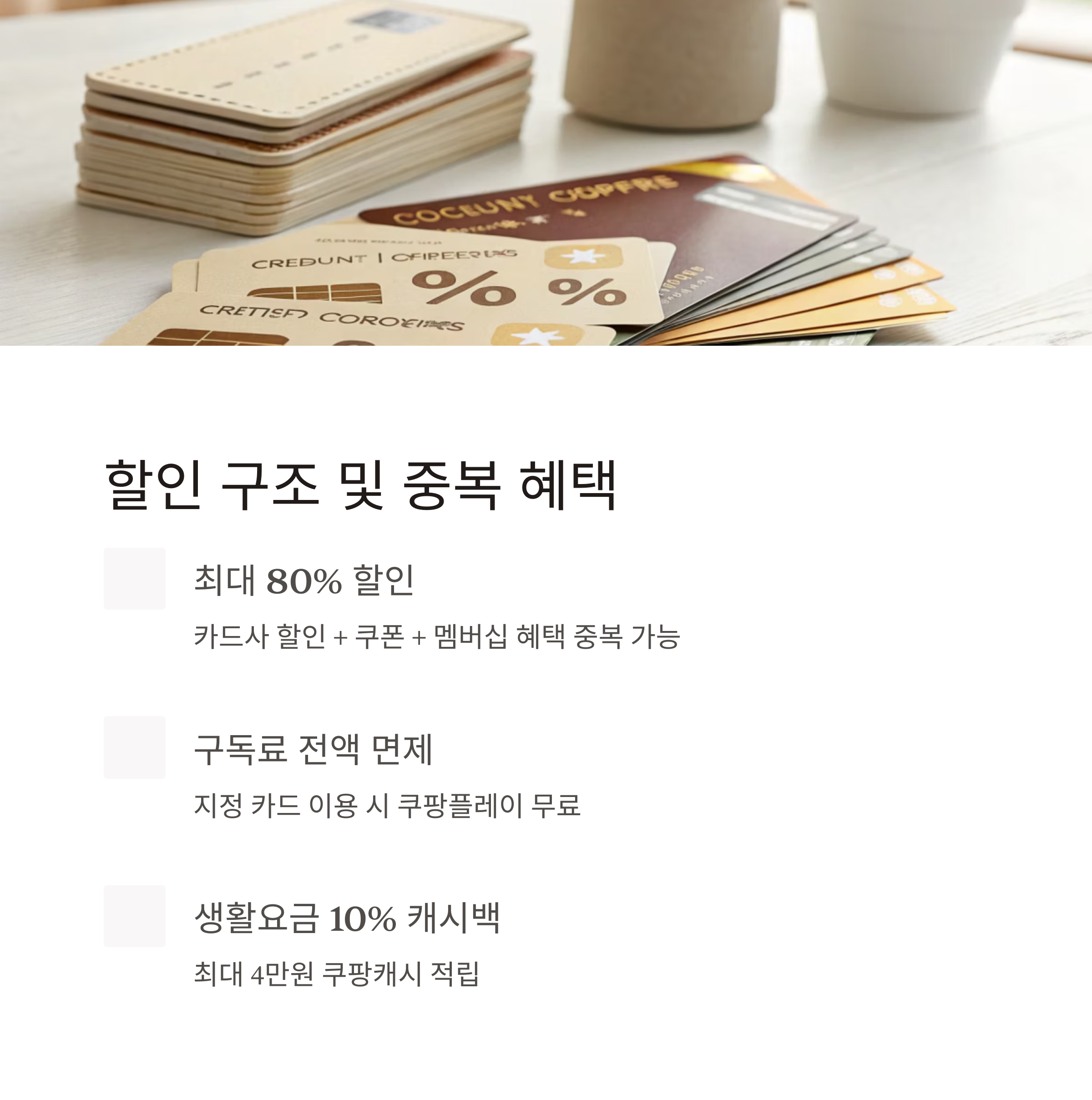 | 카드사 혜택 | 7~10% 즉시할인 + 구독료 할인 |