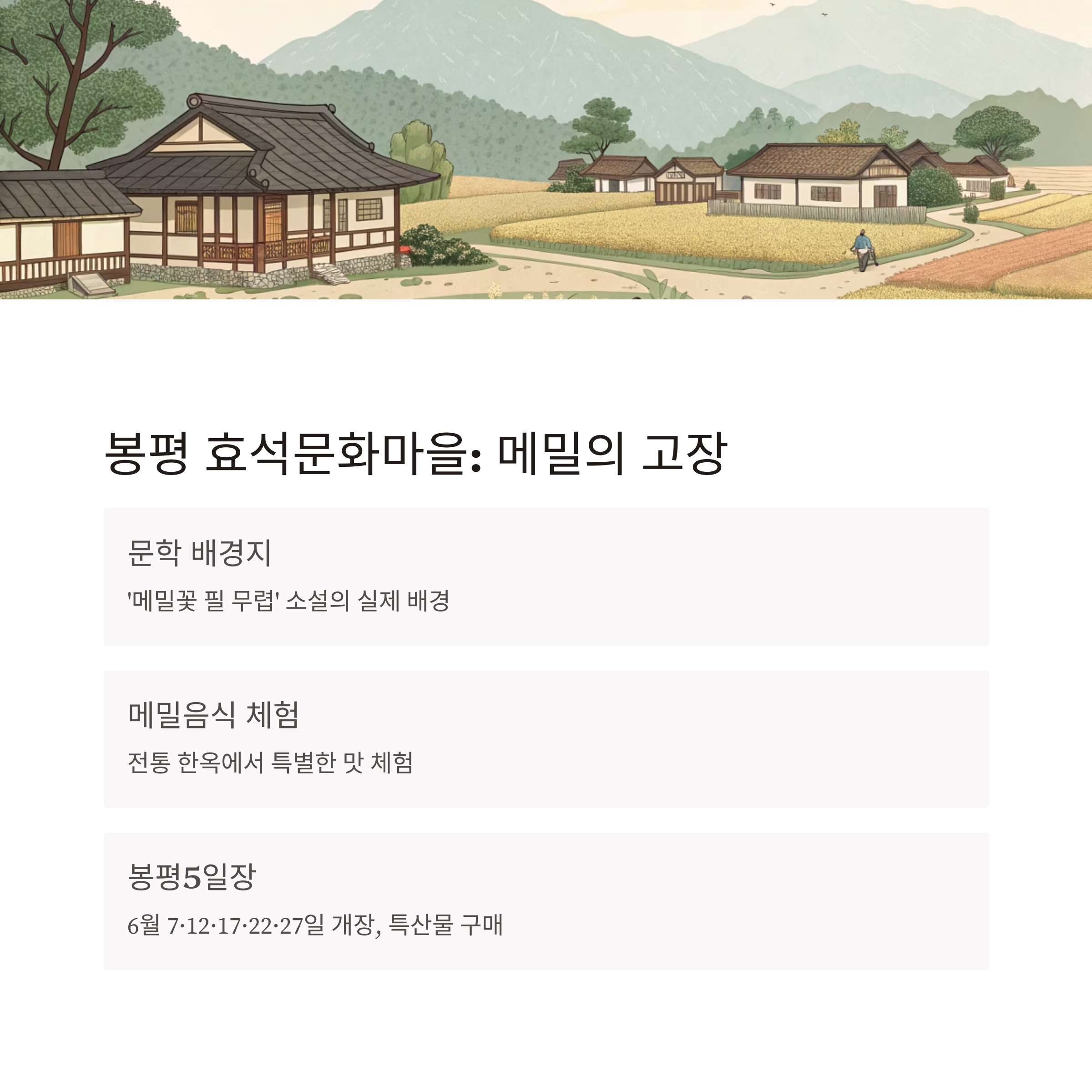 소설 ‘메밀꽃 필 무렵’의 배경지인 이 마을에서는 전통 한옥과 메밀음식 체험, 봉평5일장(6월 7·12·17·22·27일 개장)도 함께 즐길 수 있습니다.