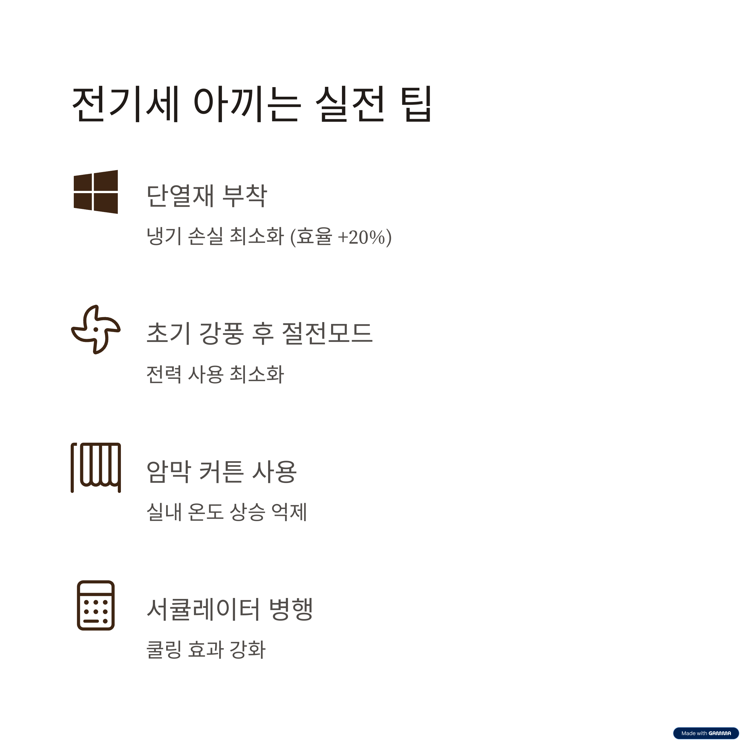 효율적인 냉방을 위해 다음과 같은 실전 팁을 병행하면 전기세를 더 줄일 수 있습니다.