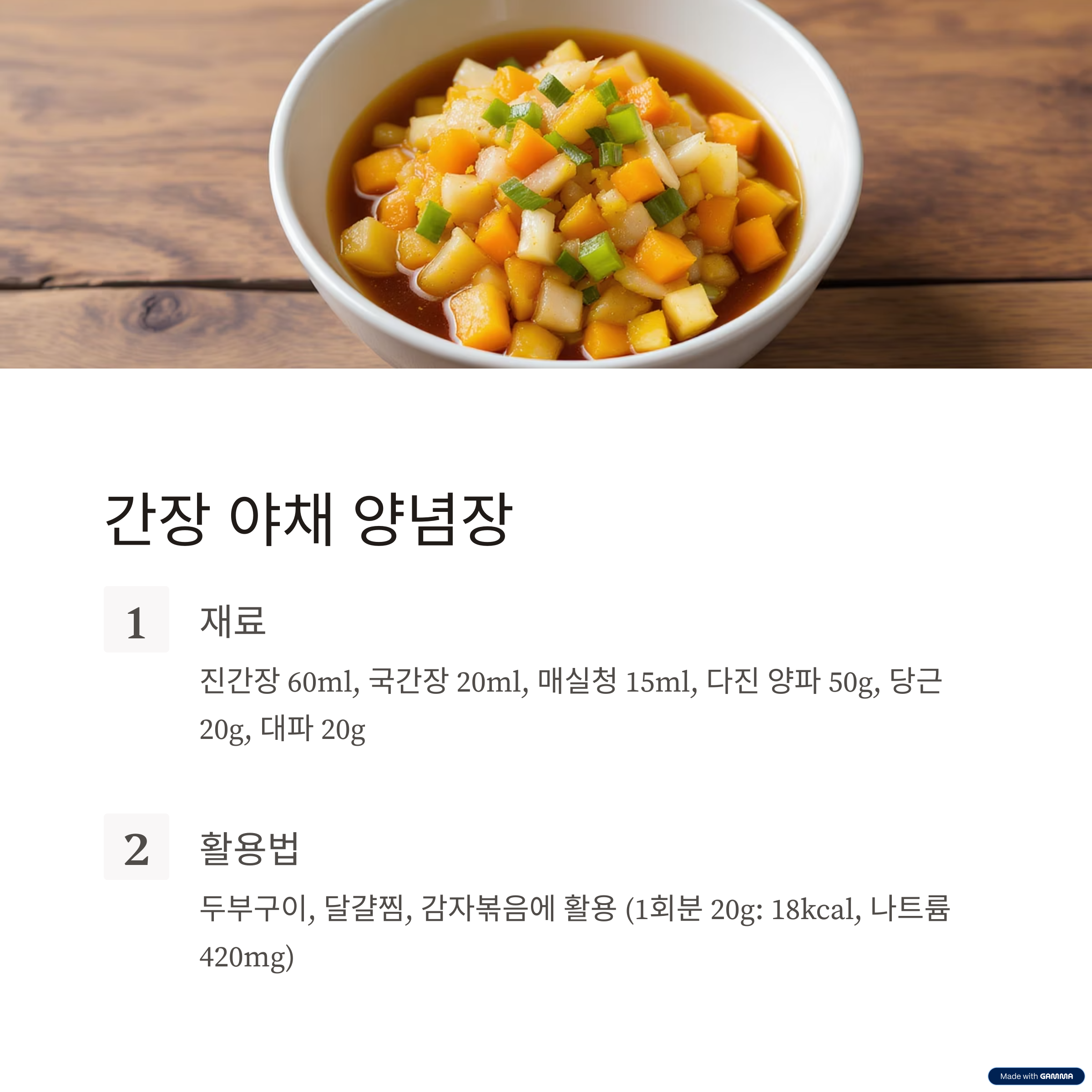 | 간장 야채 | 감칠맛, 다용도 | 420mg | 18kcal | 두부, 달걀, 볶음 |